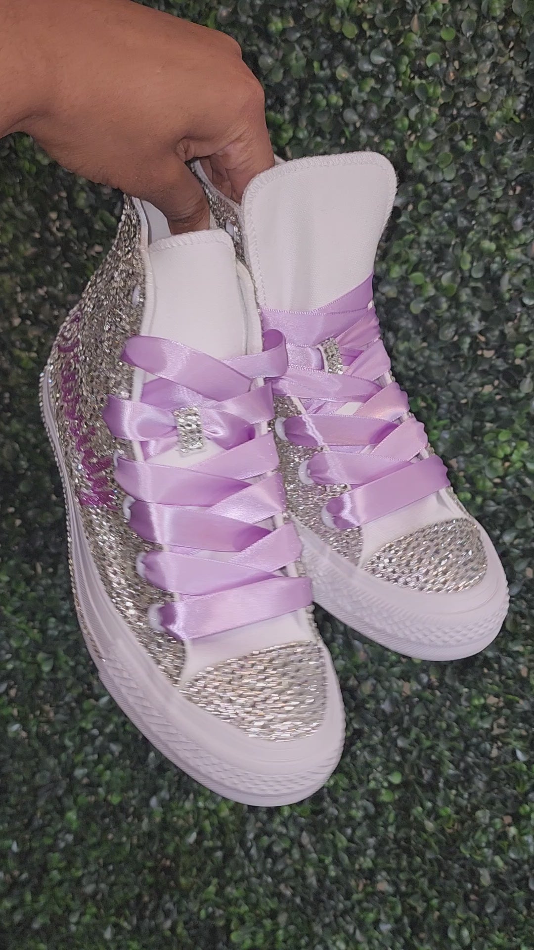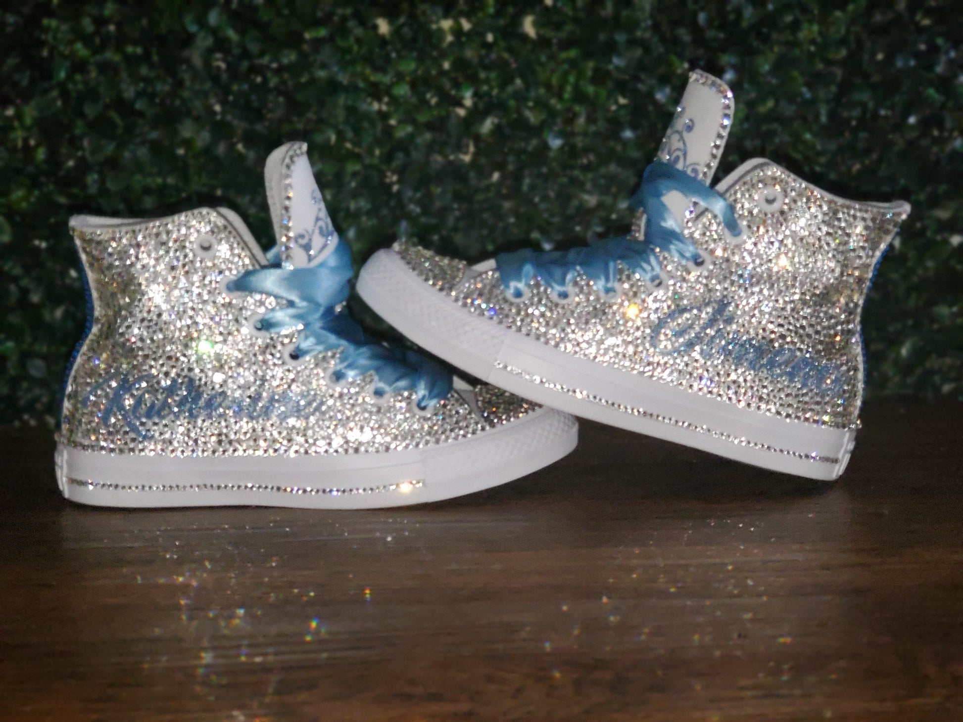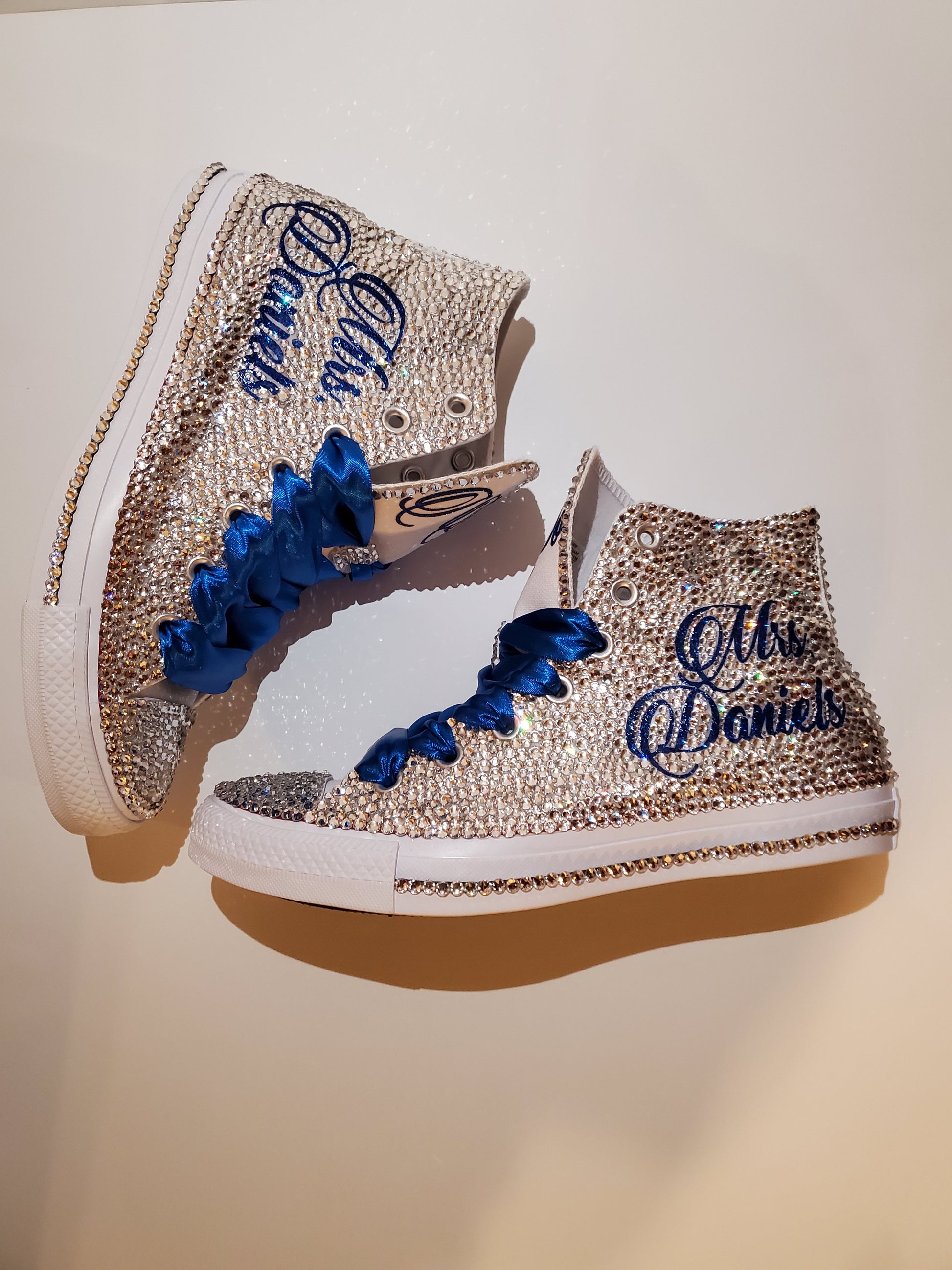 These shoes are fully customizable with your choice of color crystals, wording and ribbon shoelaces.