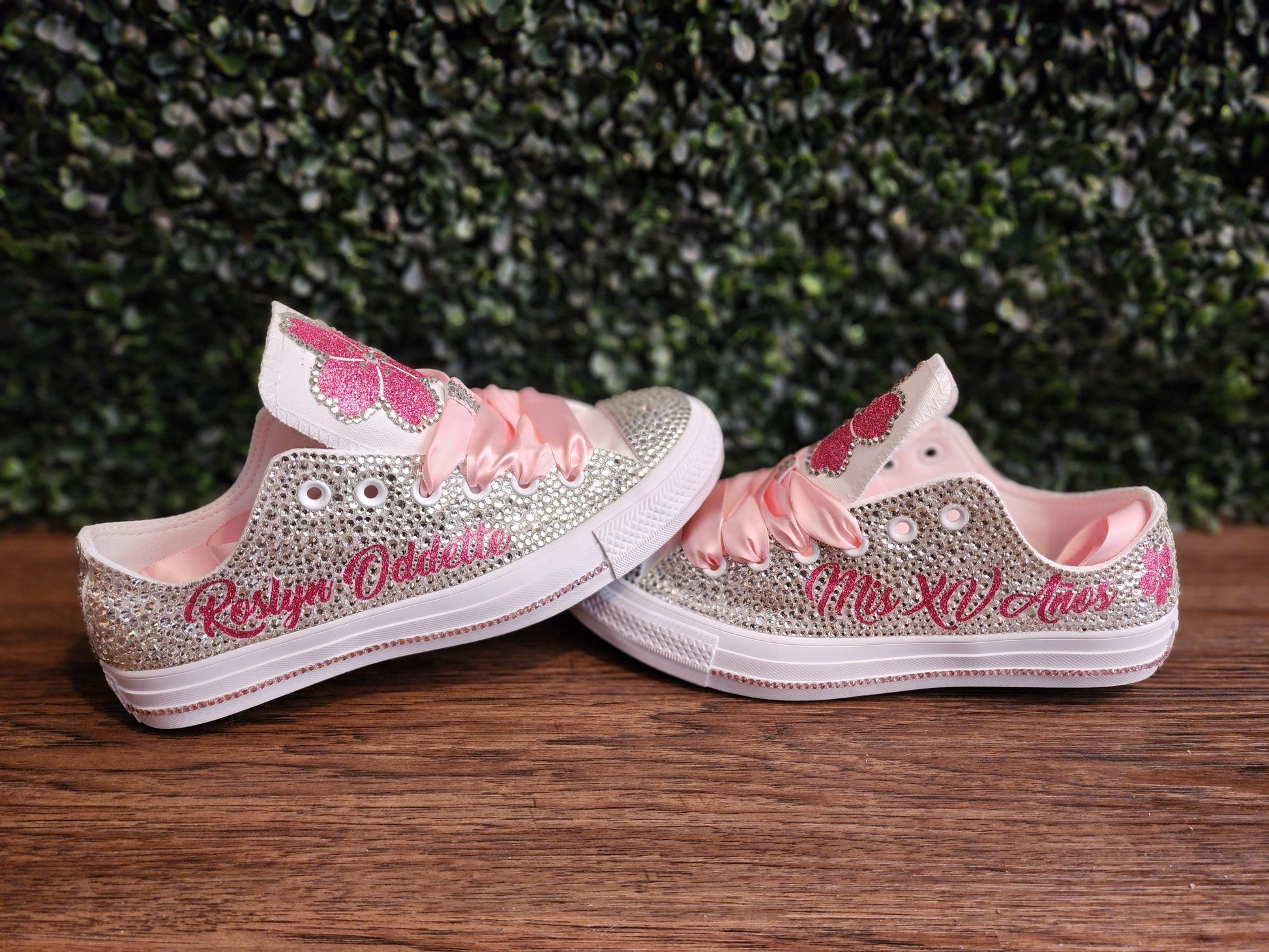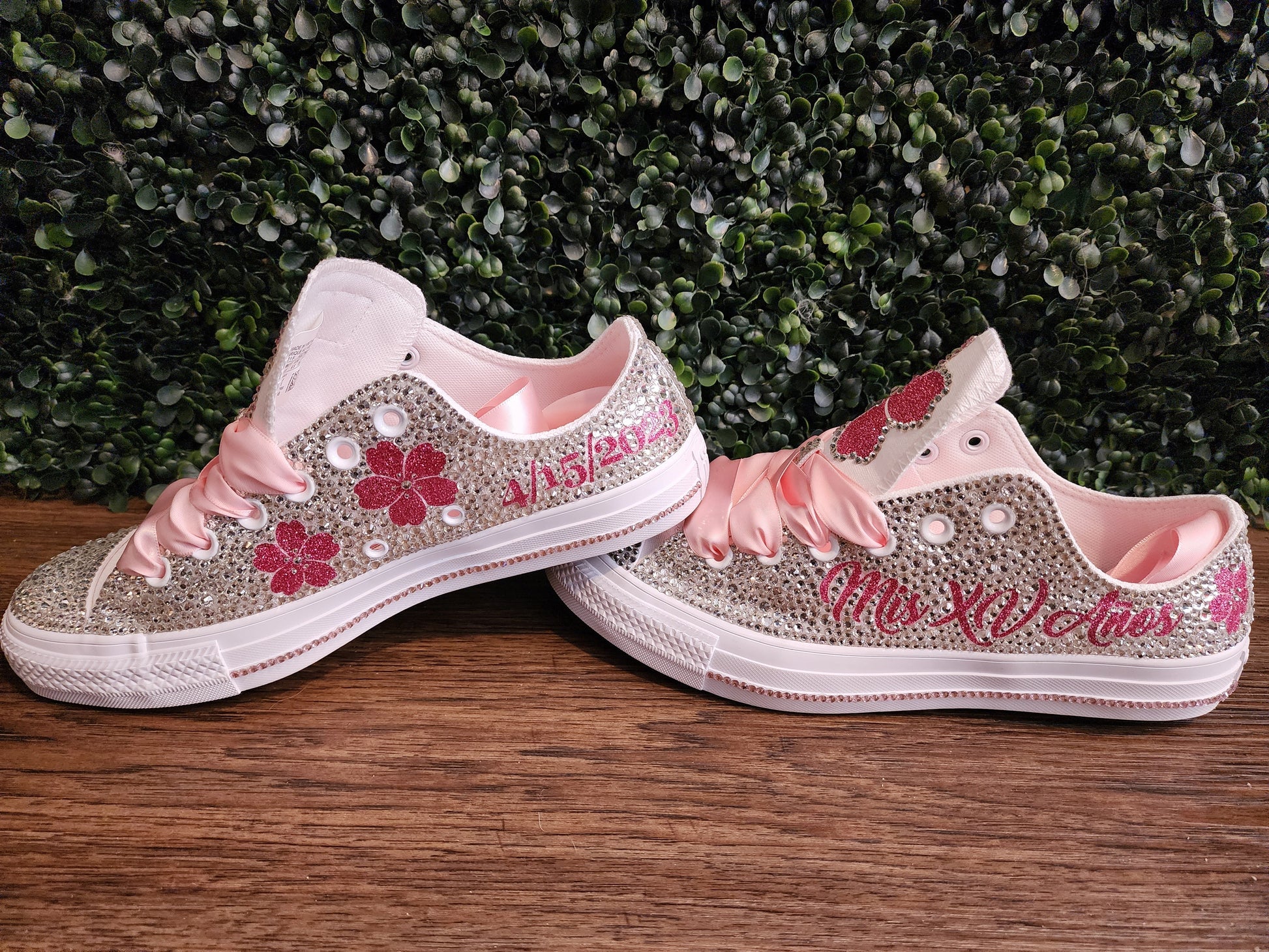 These shoes are fully customizable with your choice of color crystals, wording and ribbon shoelaces.