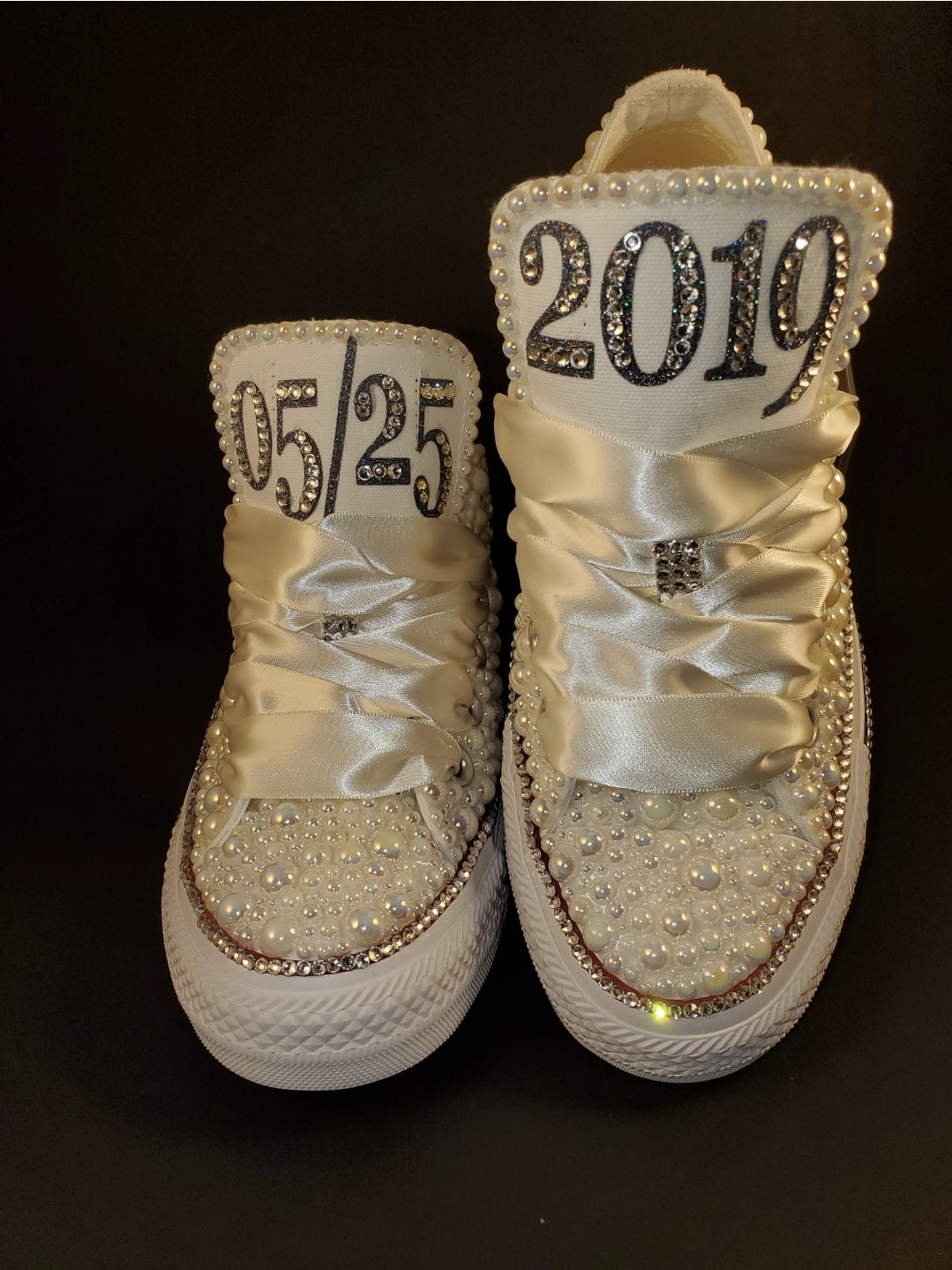 These shoes are fully customizable with your choice of color pearls, crystals, wording and ribbon shoelaces.